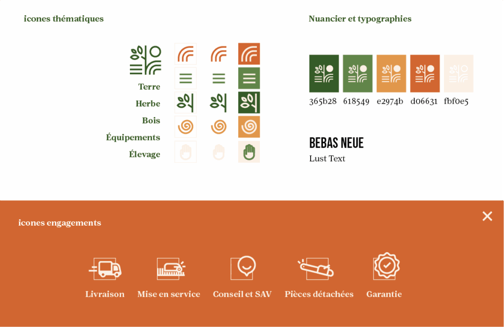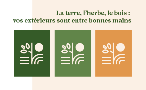 Le territoire de marque a été condensé en un triptyque limpide : La terre · L’herbe · Le bois. Trois mots qui disent tout des activités de leurs clients.