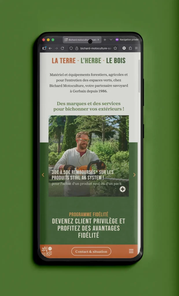 Le nouveau site bichard-motoculture-savoie.fr est le reflet direct de ce repositionnement. Sobre, rapide, optimisé mobile. Une navigation intuitive par univers produit (herbe, bois, terre, équipement, élevage). Des pages services détaillées pour l’atelier (révision, affûtage, diagnostic). Et un design qui met en valeur l’identité visuelle sans la surcharger.